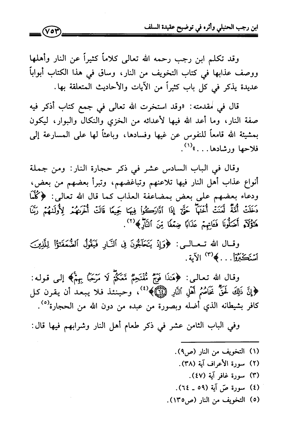 وقد تكلم ابن رجب رحمه الله تعالى كلامًا كثيرًا عن النار وأهلها ووصف عذابها في كتاب التخويف من النار، وساق في هذا الكتاب أبوابًا عديدة يذكر في كل باب كثيرًا من الآيات والأحاديث المتعلقة بها.