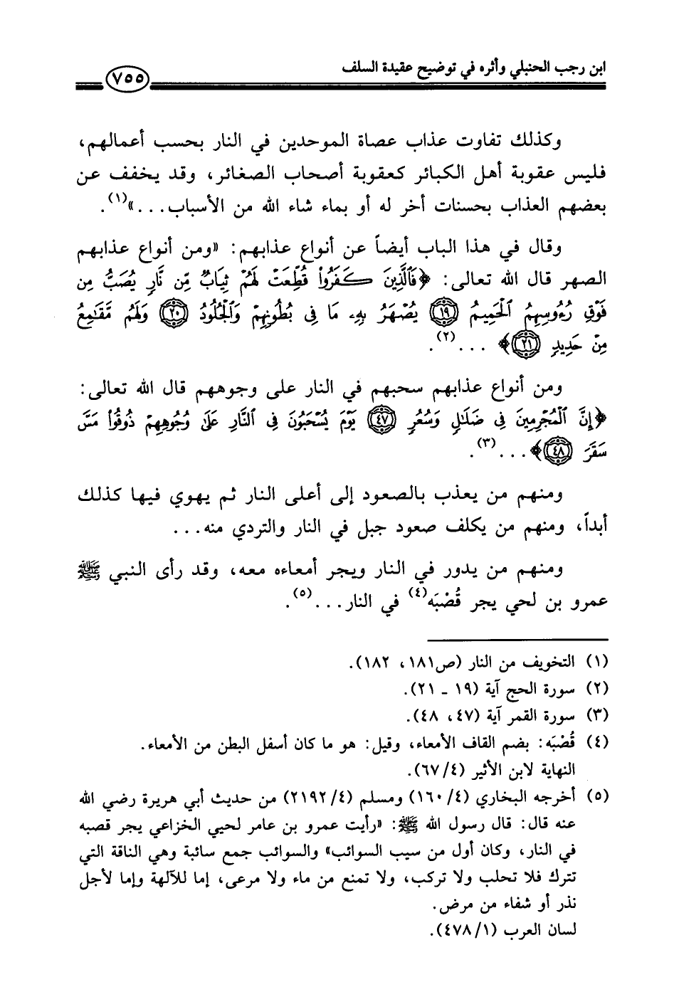 ومنهم من يدور في النار ويجر أمعاءه معه، وقد رأى النبي - صلى الله عليه وسلم - عمرو بن لحي يجر قُصْبَه (¬٤) في النار. . . (¬٥).