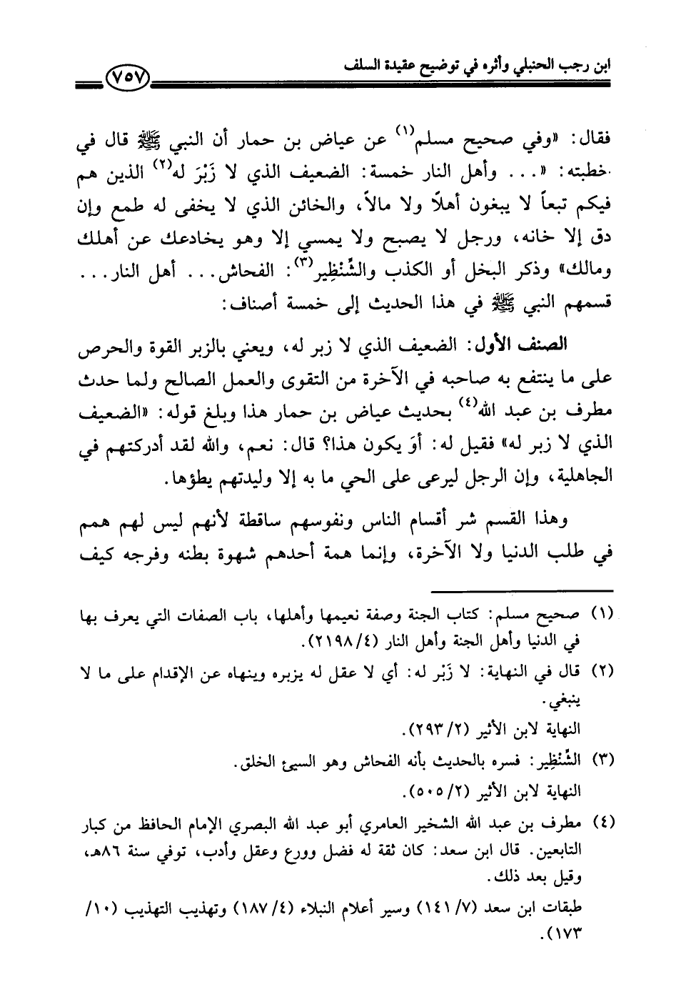 الصنف الأول: الضعيف الذي لا زبر له، ويعني بالزبر القوة والحرص على ما ينتفع به صاحبه في الآخرة من التقوى والعمل الصالح ولما حدث مطرف بن عبد الله (¬٤) بحديث عياض بن حمار هذا وبلغ قوله: "الضعيف الذي لا زبر له" فقيل له: أوَ يكون هذا؟ قال: نعم، والله لقد أدركتهم في الجاهلية، وإن الرجل ليرعى على الحي ما به إلا وليدتهم يطؤها.