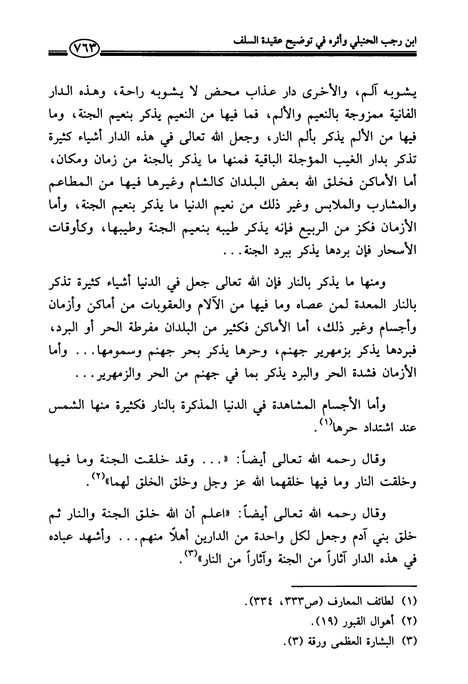 وقال رحمه الله تعالى أيضًا: "اعلم أن الله خلق الجنة والنار ثم خلق بني آدم وجعل لكل واحدة من الدارين أهلًا منهم ... وأشهد عباده في هذه الدار آثارًا من الجنة وآثارًا من النار" (¬٣).
