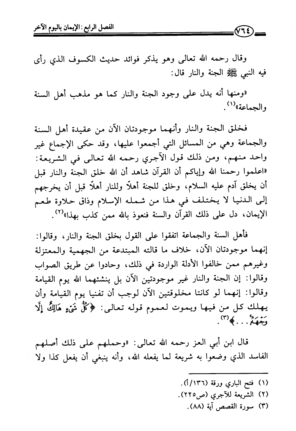 فأهل السنة والجماعة اتفقوا على القول بخلق الجنة والنار، وقالوا: إنهما موجودتان الآن، خلاف ما قالته المبتدعة من الجهمية والمعتزلة وغيرهم ممن خالفوا الأدلة الواردة في ذلك، وحادوا عن طريق الصواب وقالوا: إن الجنة والنار غير موجودتين الآن بل ينشئهما الله يوم القيامة وقالوا: إنهما لو كانتا مخلوقتين الآن لوجب أن تفنيا يوم القيامة وأن يهلك كل من فيها ويموت لعموم قوله تعالى: {كُلُّ شَيْءٍ هَالِكٌ إِلَّا وَجْهَهُ ... } (¬٣).