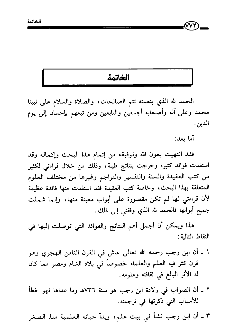 ٢ - أن الصواب في ولادة ابن رجب هو سنة ٧٣٦ هـ وما عداها فهو خطأ للأسباب التي ذكرتها في ترجمته.