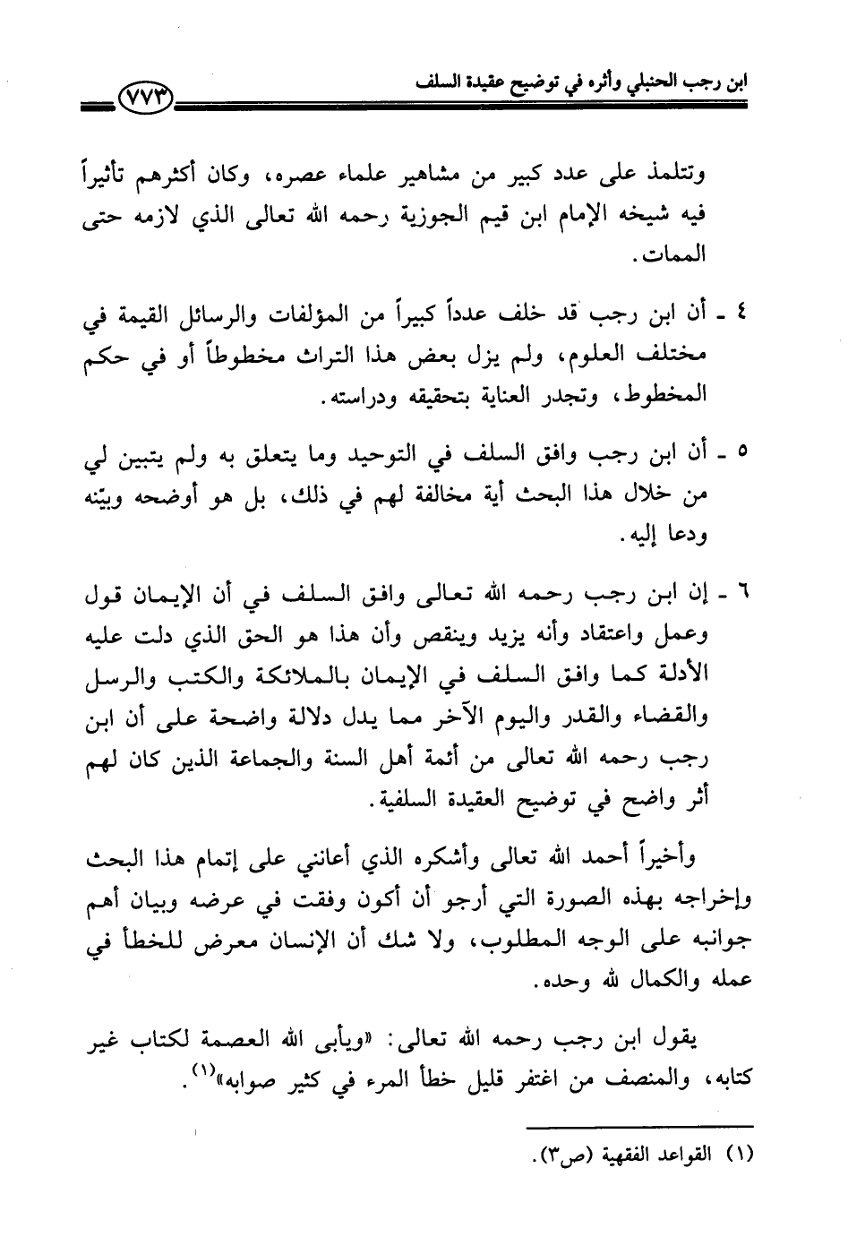 ٥ - أن ابن رجب وافق السلف في التوحيد وما يتعلق به ولم يتبين لي من خلال هذا البحث أية مخالفة لهم في ذلك، بل هو أوضحه وبيّنه ودعا إليه.