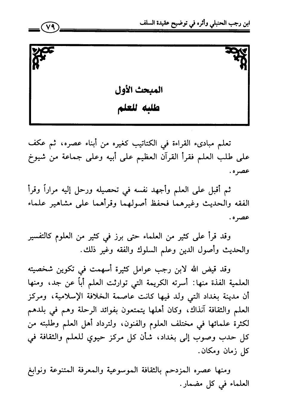 وقد قيض الله لابن رجب عوامل كثيرة أسهمت في تكوين شخصيته العلمية الفذة منها: أسرته الكريمة التي توارثت العلم أبًا عن جد، ومنها أن مدينة بغداد التي ولد فيها كانت عاصمة الخلافة الإسلامية، ومركز العلم والثقافة آنذاك، وكان أهلها يتمتعون بفوائد الرحلة وهم في بلدهم لكثرة علمائها في مختلف العلوم والفنون، ولترداد أهل العلم وطلبته من كل حدب وصوب إلى بغداد، شأن كل مركز حيوي للعلم والثقافة في كل زمان ومكان.
