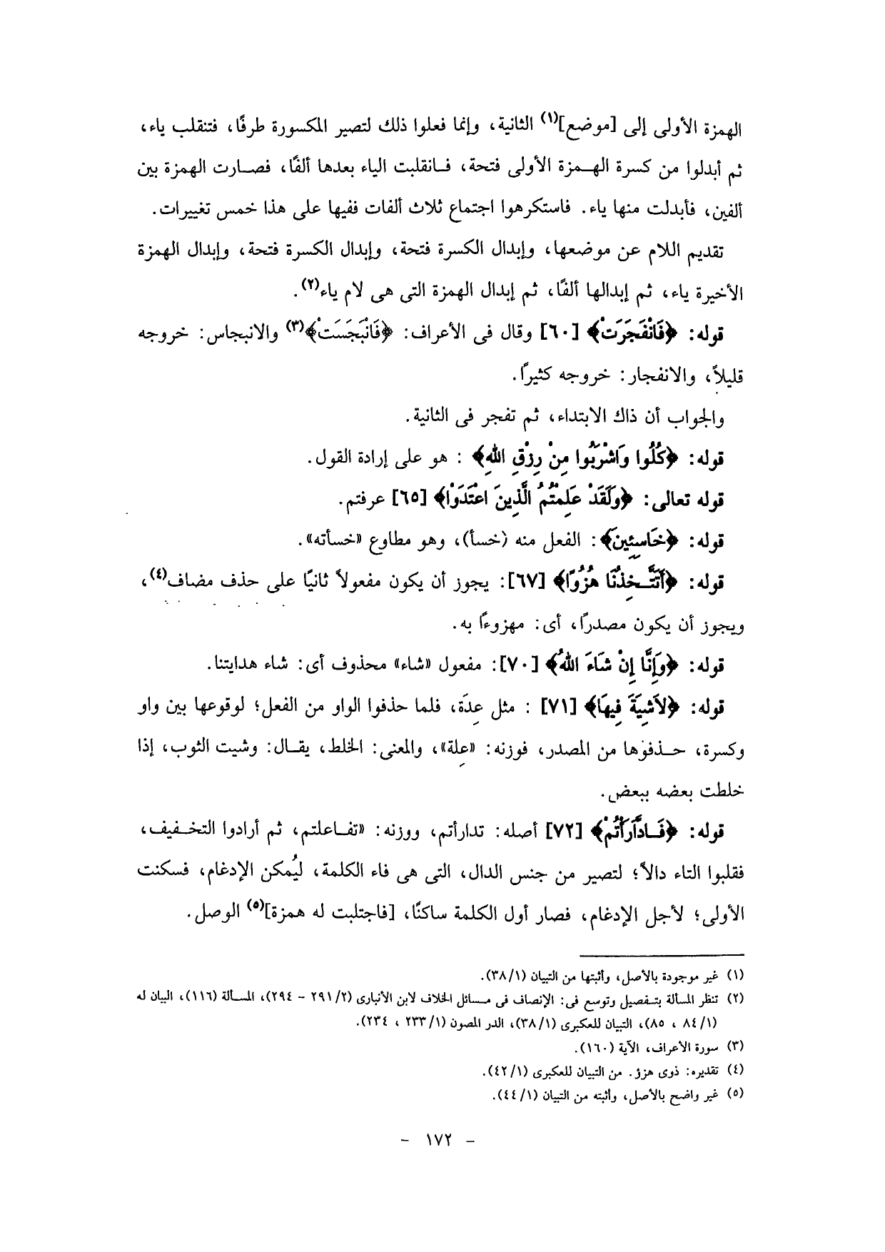 الهمزة الأولى إلى موضع، الثانية، وإنما فعلوا ذلك لتصير المكسورة طرفًا، فتنقلب ياء، ثم أبدلوا من كسرة الهمزة الأولى فتحة، فانقلبت الياء بعدها ألفا، فصارت الهمزة بين ألفين، فأبدلت منها ياء. فاستكرهوا اجتماع ثلاث ألفات ففيها على هذا خصص تغييرات.