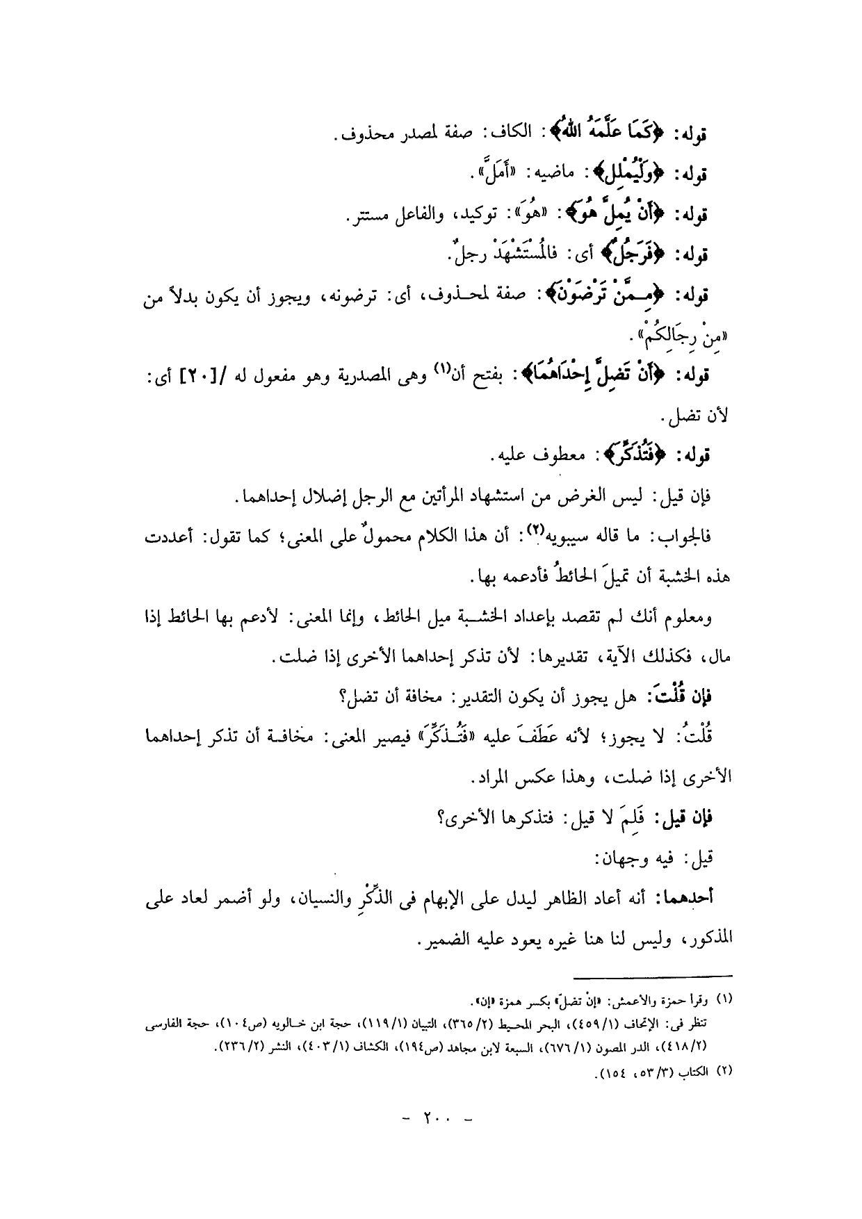 قوله: (أَنْ تَضِلَّ إِحْدَاهُمَا) : بفتح أن وهي المصدرية وهو مفعول له