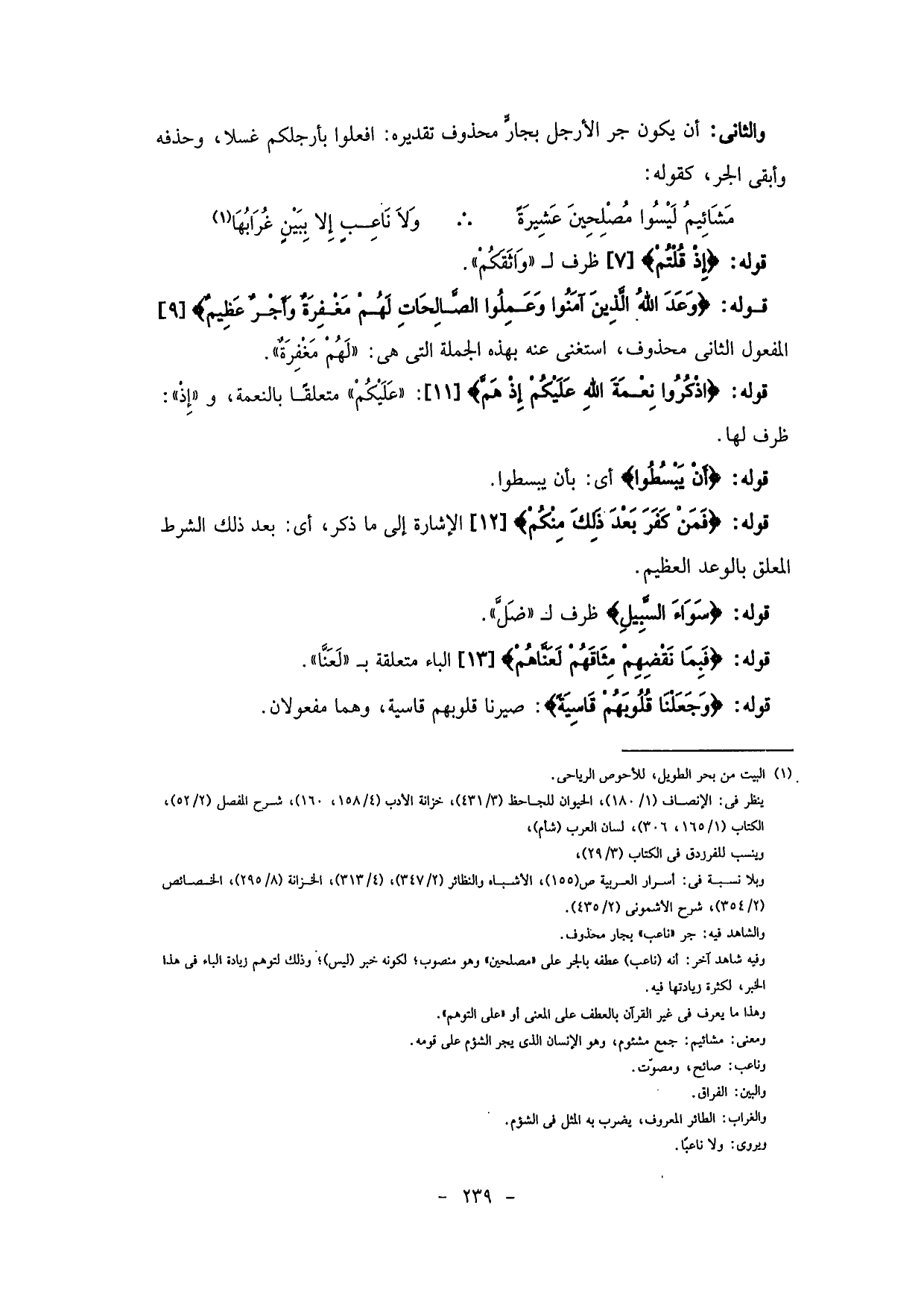 والثانى: أن يكون جر الأرجل بجارّ محذوف تقديره: افعلوا بأرجلكم غسلا، وحذفه وأبقى الجر، كقوله: