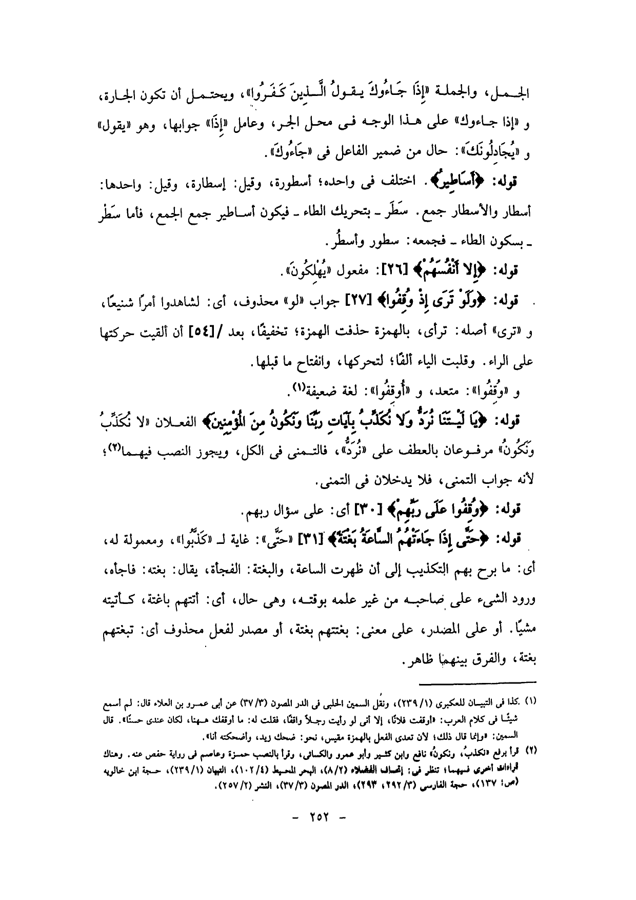 قوله: (وَلَوْ تَرَى إِذْ وُقِفُوا) : جواب " لولا" محذوف، أي: لشاهدوا أمرًا شنيعا، و "ترى" أصله: ترأى، بالهمزة حذفت الهمزة؛ تخفيفًا، بعد أن ألقيت حركتها على الراء. وقلبت الياء ألفا؛ لتحركها، وانفتاح ما قبلها.
