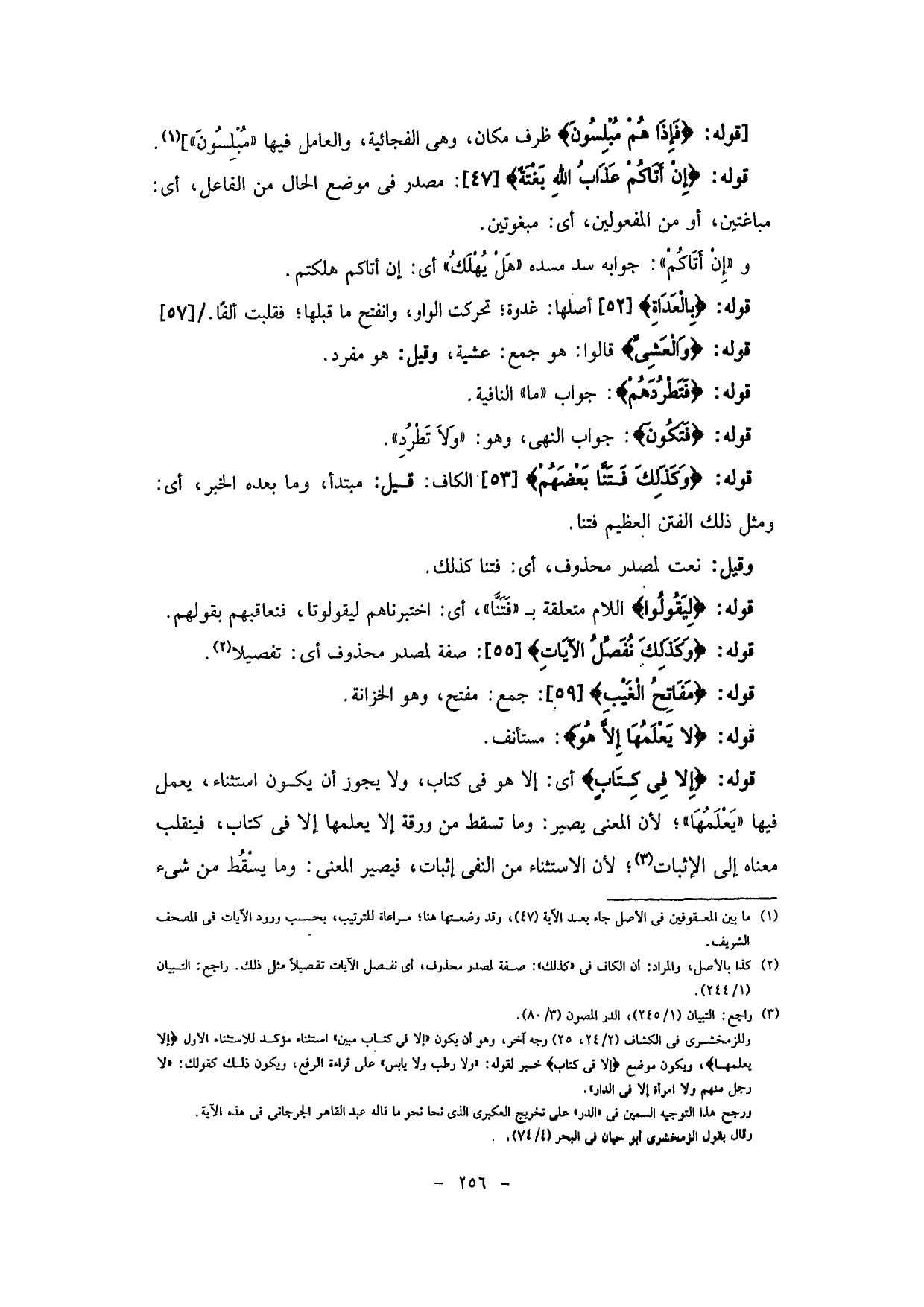 قوله: (إِلَّا فِي كِتَابٍ) أي: إلا هو في كتاب، ولا يجوز أن يكون استثناء، يعمل فيها " يَعْلَمهَا "؛ لأن المعنى يصير: وما تسقط من ورقة إلا يعلمها إلا في كتاب، فينقلب معناه إلى الإثبات؛ لأن الاستثناء من النفي إثبات، فيصير المعنى: وما يسقُط من شيء