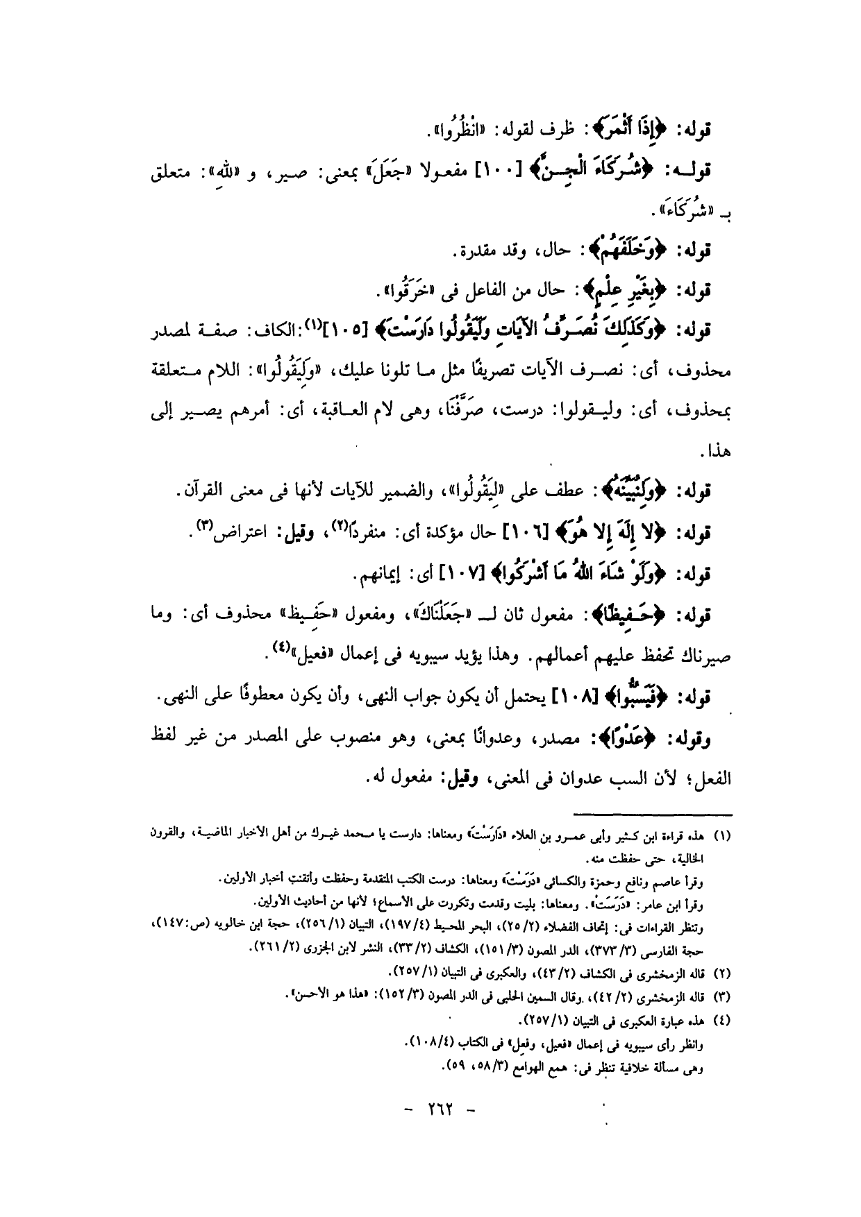 الكاف؛ صفة لمصدر محذوف، أي: نصرف الآيات تصريفا مثل ما تلونا عليك، (وَلِيَقُولُوا) : اللام متعلقة بمحذوف، أي: وليقولوا: درست، صَرَّقنَا، وهي لام العاقبة، أي: أمرهم يصير إلى هذا.