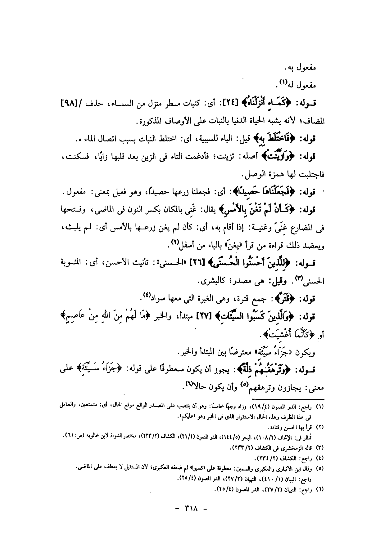 قوله: (كَأَنْ لَمْ تَغْنَ بِالْأَمْسِ) : يقال: غَنِى بالمكان بكسر النون في الماضي، وفتحها فى المضارع غني وغنية: إذا أقام به، أي: كأن لم يغن زرعها بالأمس أي: لم يلبث، ويعضد ذلك قراءة من قرأ " يغنَ " بالياء من أسفل.