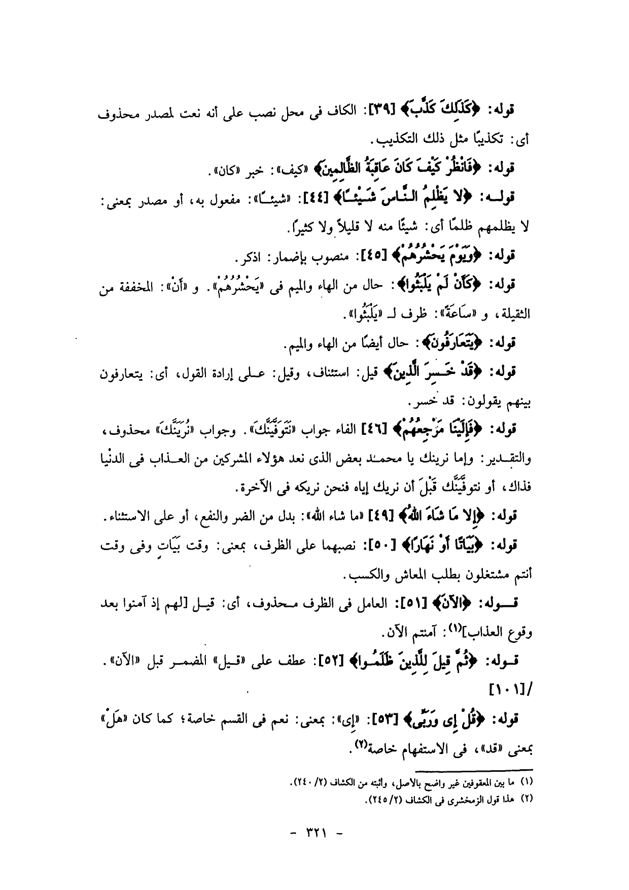 قوله: (كَأَنْ لَمْ يَلْبَثُوا) : حال من الهاء والميم في " يَحْشُرُهُمْ ".