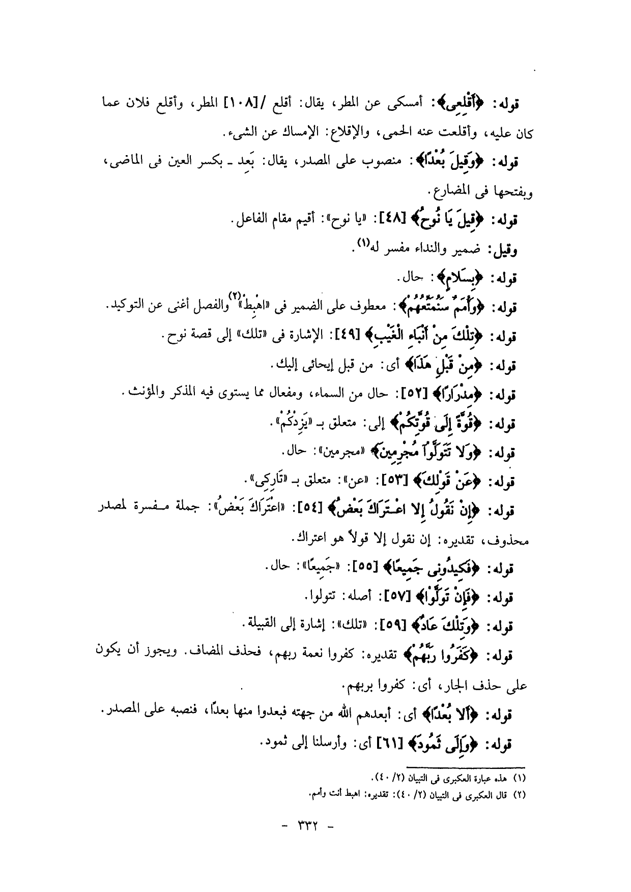 قوله: (قِيلَ يَا نُوحُ) : (يَا نُوحُ) : أقيم مقام الفاعل.