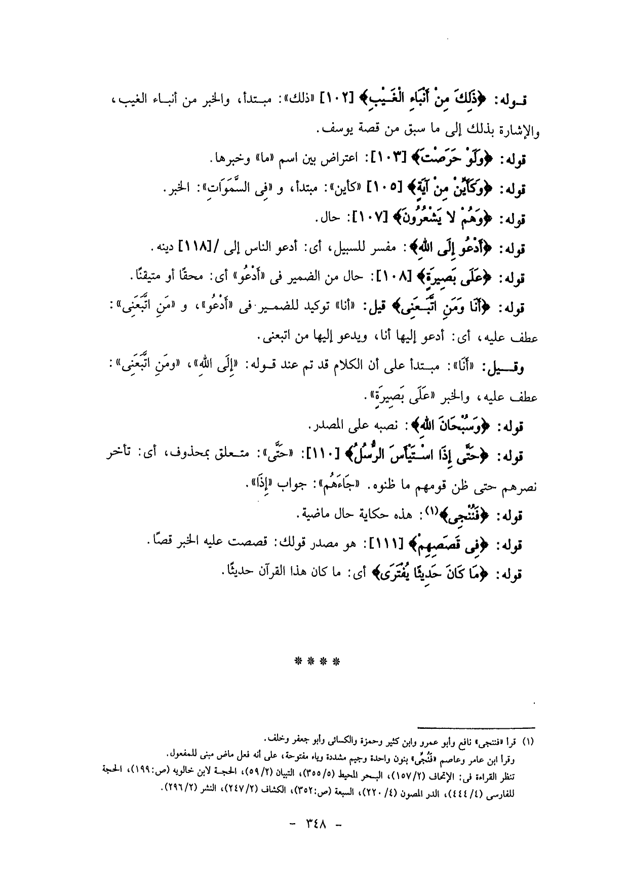 (ذلك) : مبتدأ، والخبر (مِنْ أَنْبَاءِ الْغَيْبِ، والإشارة بذلك إلى ما سبق من قصة يوسف.