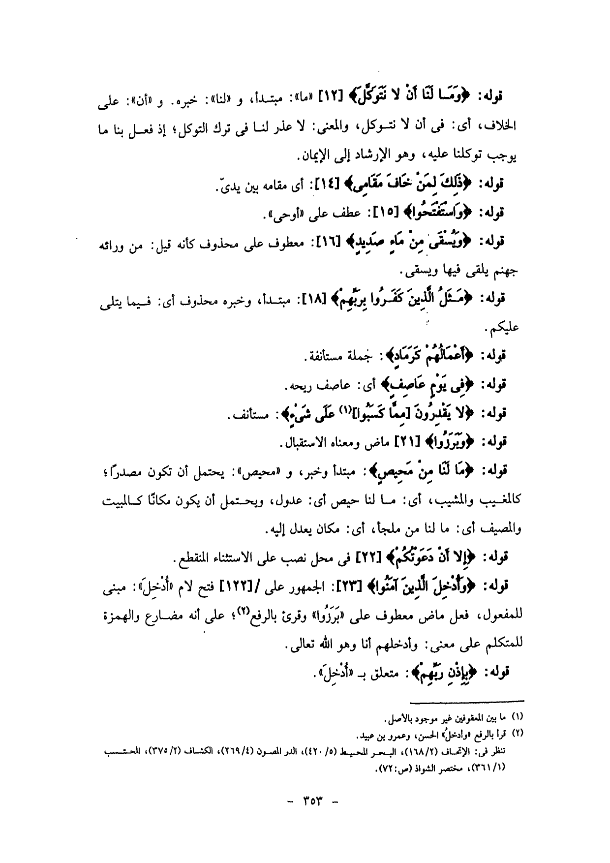 قوله: (مَا لَنَا مِنْ مَحِيصٍ) : مبتدأ وخبر، و (مَحِيصٍ) : يحتمل أن تكون مصدرًا؛ كالمغيب والمشيب، أي: ما لنا حيص أي: عدول، ويحتمل أن يكون مكانًا كالبيت والصيف أي: ما لنا من ملجأ، أي: مكان يعدل إليه.