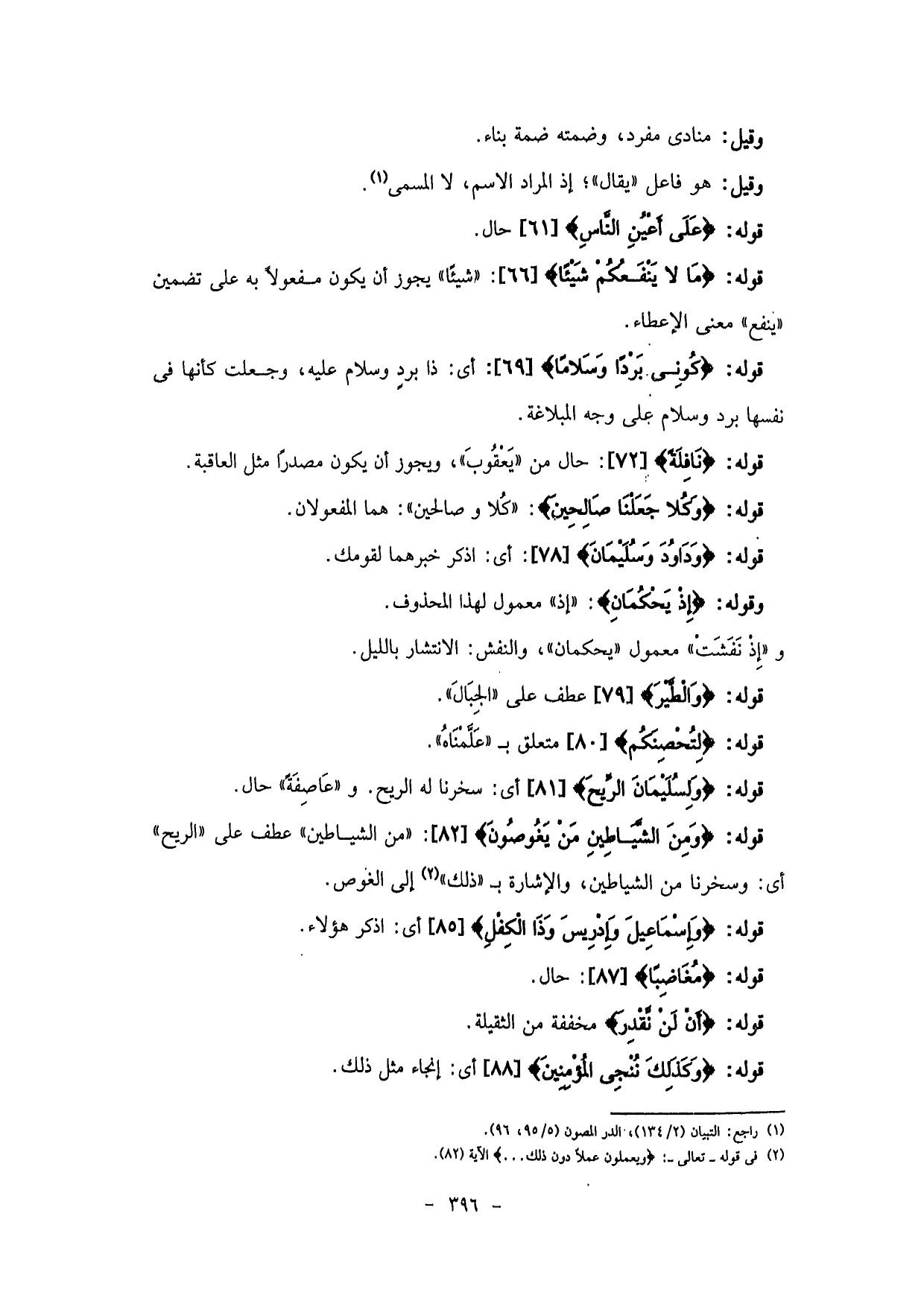 قوله: (وَكُلًّا جَعَلْنَا صَالِحِينَ) : (وَكُلًّا، صَالِحِينَ) : هما المفعولان.