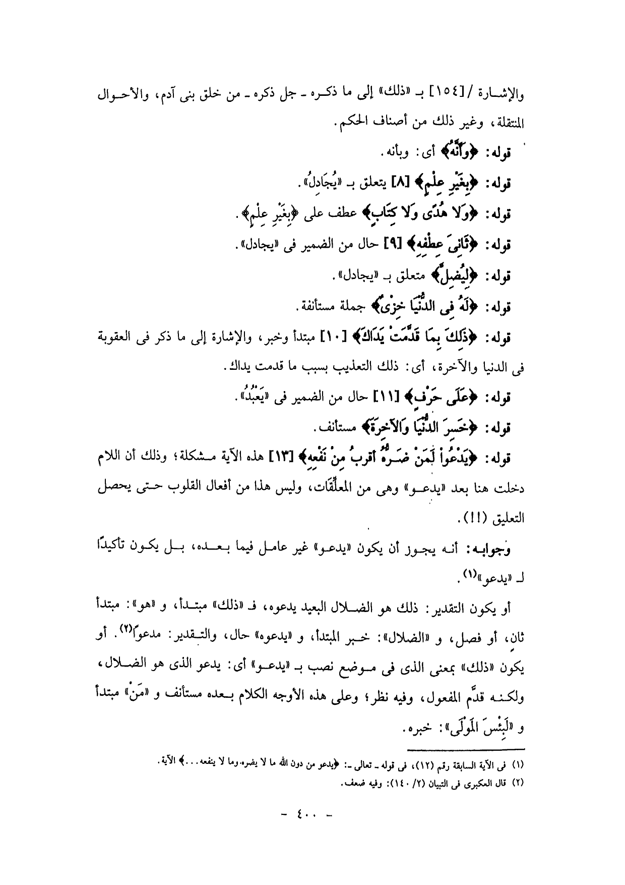 قوله: (ثَانِيَ عِطْفِهِ) : حال من الضمير في "يُجَادِلُ".