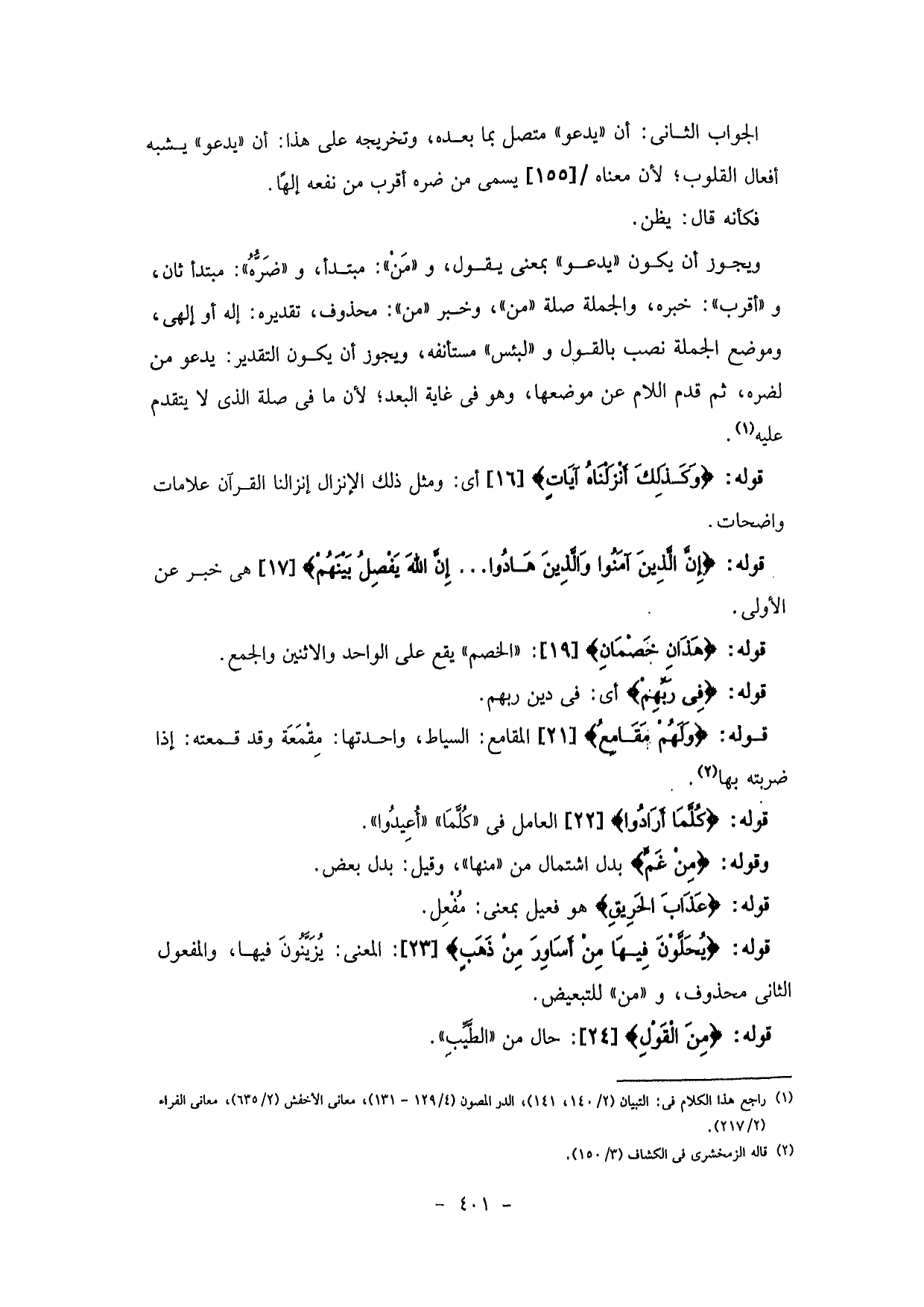 وجوز أن يكون " يدعو " بمعنى يقول، و (مَنْ) : مبتدأ، و (ضَرُّهُ) : مبتدأ ثان، و (أقرب) : خبره، والجملة صلة " من "، وخبر "من": محذوف، تقديره: إله أو إلهي، وموضع الجملة نصب بالقول و (لبئس) مستأنفة، ويجوز أن يكون التقدير: يدعو من لضره، ثم قدم اللام عن موضعها، وهو في غاية البعد؛ لأن ما في صلة الذي لا يتقدم عليه.