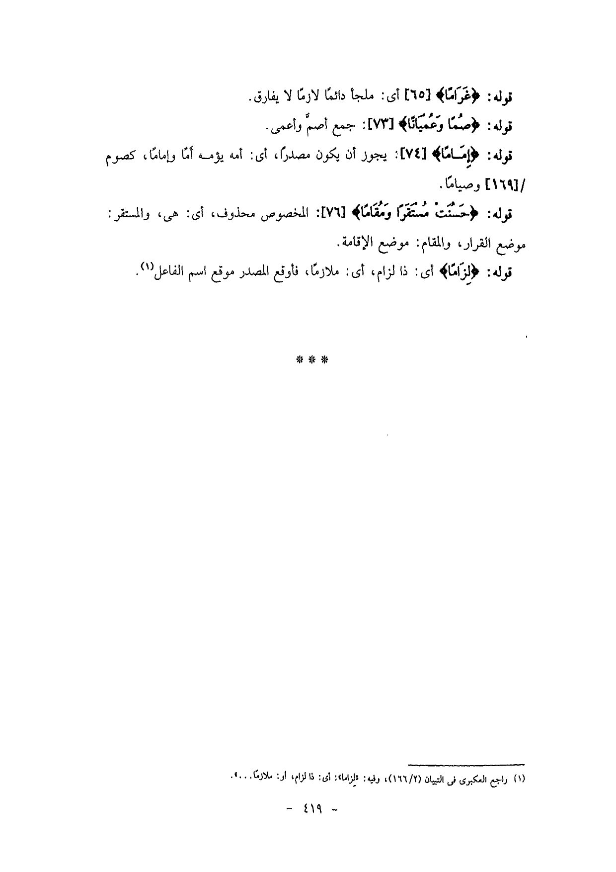 قوله: (لِزَامًا) : أي: ذا لزام، أي: ملازما، فأوقع المصدر موقع اسم الفاعل.