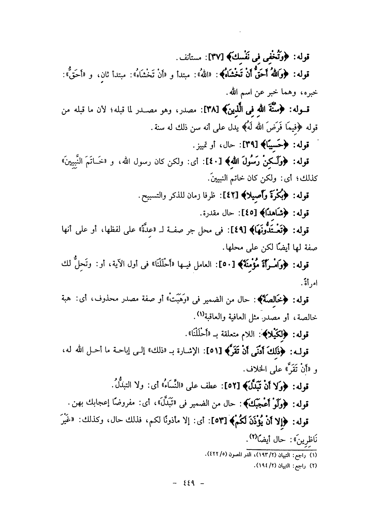 قوله: (سُنَّةَ اللَّهِ فِي الَّذِينَ خَلَوْا مِنْ قَبْلُ) : مصدر، وهو مصدر لما قبله؛ لأن ما قبله من قوله (فِيمَا فَرَضَ اللَّهُ لَهُ) يدل على أنه سن ذلك له سنة.