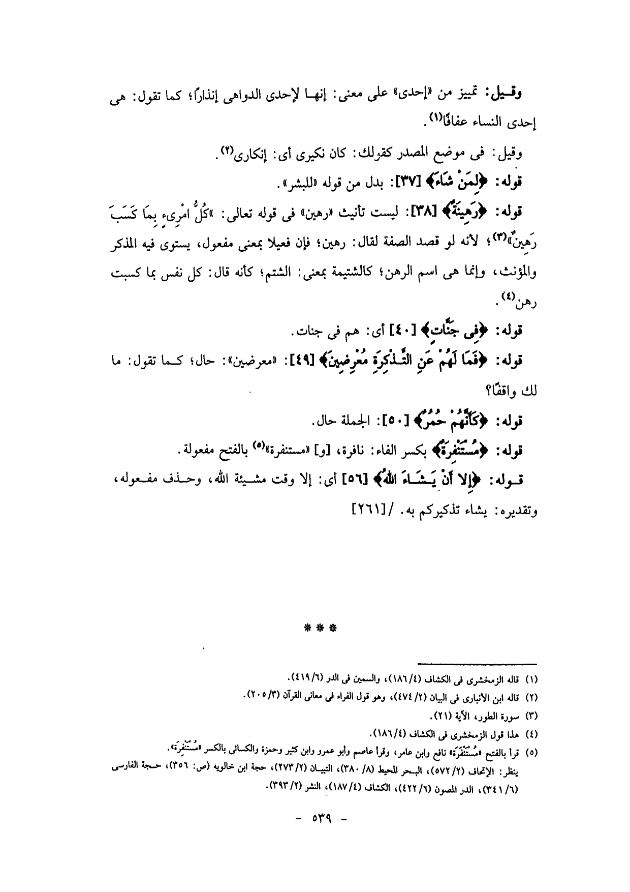 قوله: (رَهِينَةٌ) : ليست تأنيث " رهين " في قوله تعالى: (كُلُّ امْرِئٍ بِمَا كَسَبَ رَهِينٌ) ؛ لأنه لو قصد الصفة لقال: رهين؛ فإن فعيلا بمعنى مفعول، يستوى فيه المذكر والمؤنث، وإنما هي اسم الرهن؛ كالشتيمة بمعنى: الشتم؛ كأنه قال: كل نفس بما كسبت رهن.
