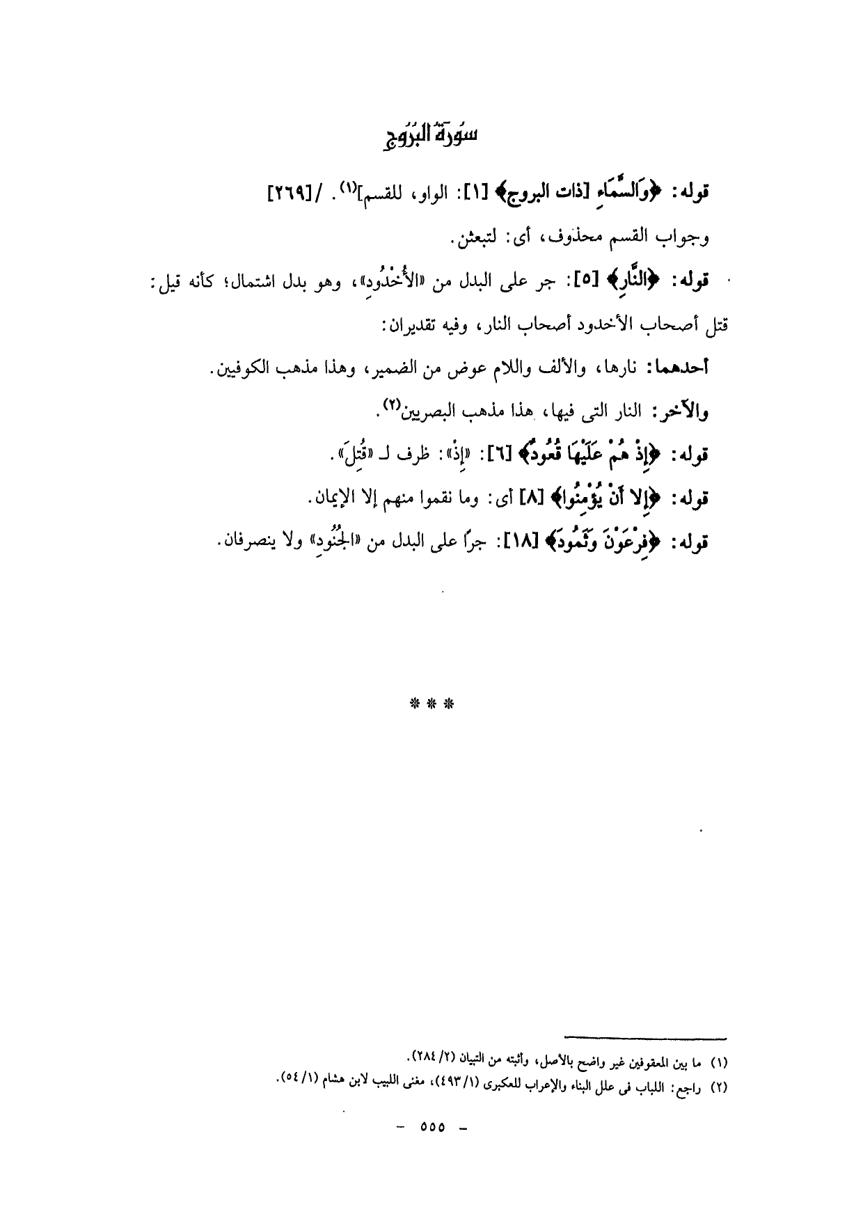 قوله: (النَّارِ) : جر على البدل من (الْأُخْدُودِ) ، وهو بدل اشتمال؛ كأنه قيل: قتل أصحاب الأخدود أصحاب النار، وفيه تقديران: