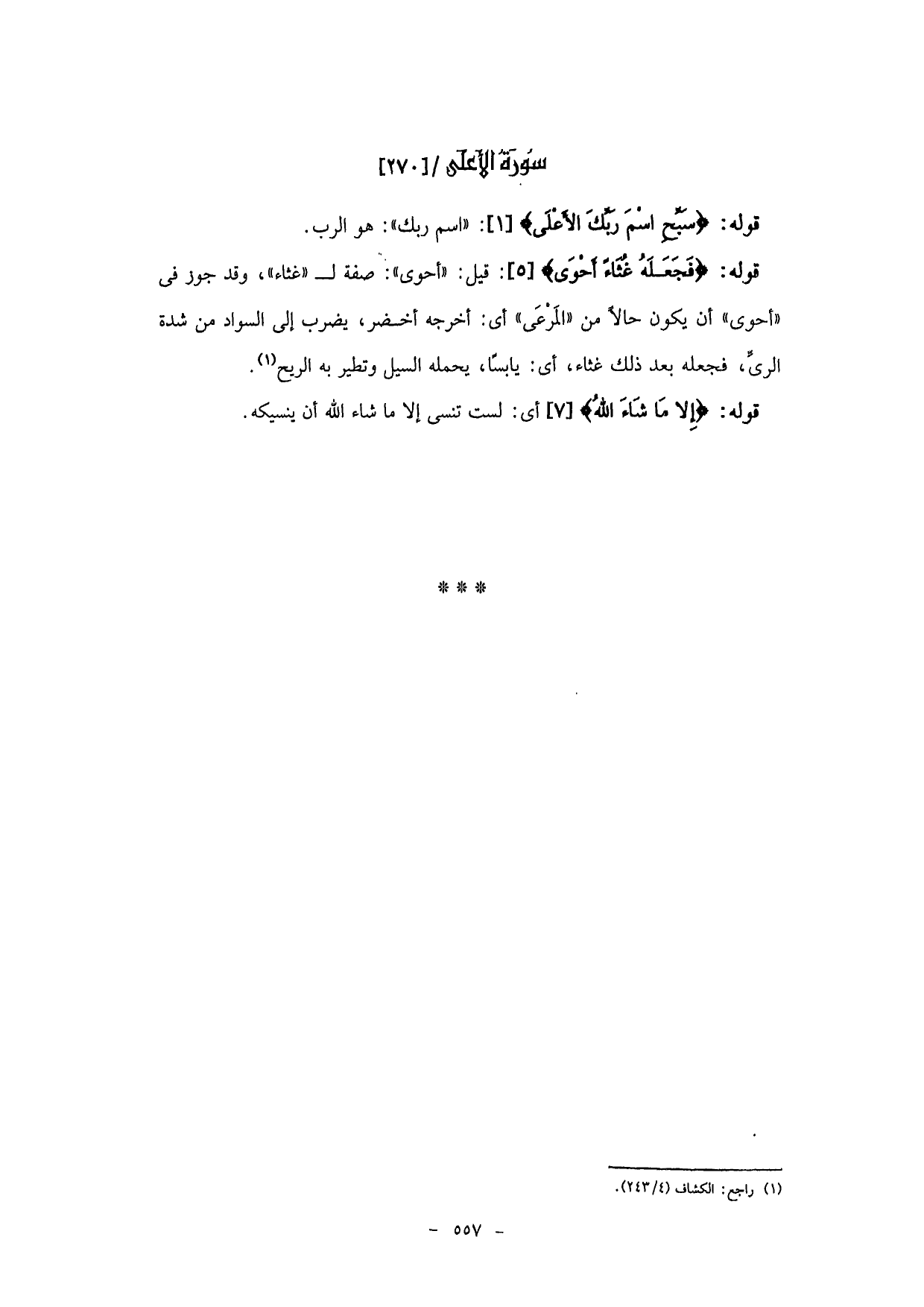 قوله: (فَجَعَلَهُ غُثَاءً أَحْوَى) : قيل: (أَحْوَى) : (صفة لـ " غثاء "، وقد جوز في " أحوى " أن يكون حالاً من " المَرْعَى) أي: أخرجه أخضر، يضرب إلى السواد من شدة الرى، فجعله بعد ذلك غثاء، أي: يابسا، يحمله السيل وتطير به الريح.