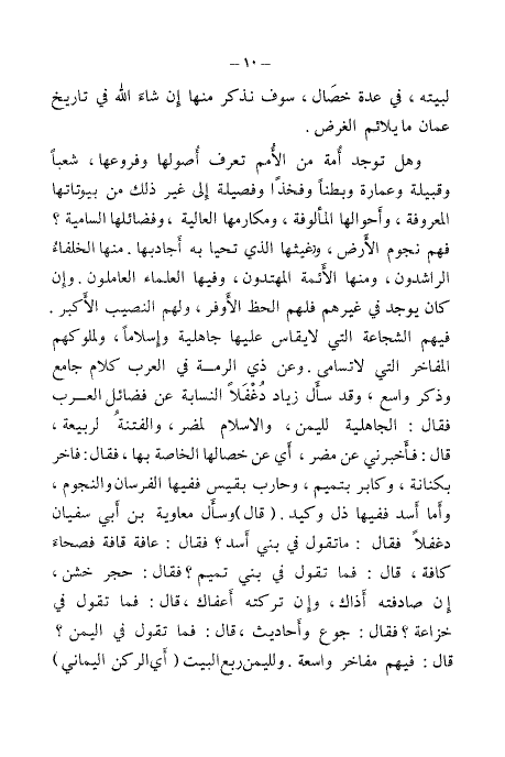 وهل توجد امة من الأمم تعرف أصولها وفروعها، شعبًا وقبيلة وعمارة وبطنًا وفخذا وفصيلة إلى غير ذلك من بيوتاتها المعروفة، واحوالها المألوفة، ومكارمها العالية، وفضائلها السامية؟ فهم نجوم الأرض، وغيثها الذي تحيا به أجادبها. منها الخلفاءُ الراشدون، ومنها الأئمة المهتدون، وفيها العلماء العاملون، وإن كان يوجد في غيرهم فلهم الحظ الأوفر، ولهم النصيب الأكبر. فيهم الشجاعة التي لا يقاس عليها جاهلية وإسلامًا، ولملوكهم المفاخر التي لا تسامى. وعن ذي الرمة في العرب كلام جامع وذكر واسع، وقد سأل زيادٌ دُغْفَلًا النسابة عن فضائل العرب فقال: الجاهلية لليمن، الإسلام لمضر، والفتنة لربيعة، قال: فأخبرني عن مضر، أي أن خصالها الخاصة بها، فقال: فاخر بكنانة، وكابر بتميم، وحارب بقيس ففيها الفرسان والنجوم، وأما أسد ففيها ذل وكيد. (قال:) وسأل معاوية بن أبي سفيان دغفلًا فقال: ما تقول في بني أسد؟ فقال: عافة قافة فصحاء كافة، قال: فما تقول في بني تميم؟ فقال: حجر خشن، إن صادفته آذاك، وإن تركته أعفاك، قال: فما تقول في خزاعة؟ فقال: جوع وأحاديث، قال: فما تقول في اليمن؟ قال: فيهم مفاخر واسعة. ولليمن ربع البيت " (أي الركن اليماني)