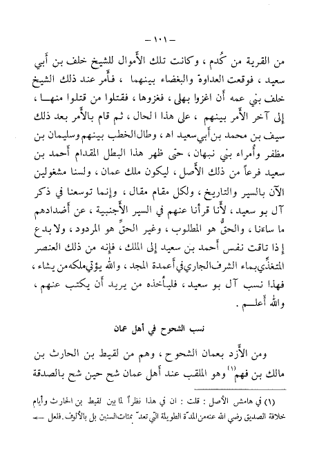 من القرية من كدم، وكانت تلك الأموال للشيخ خلف بن أبي سعيد، فوقعت العداوة والبغضاء بينهما، فأمر عند ذلك الشيخ خلف بني عمه أن أغزوا بهلى، فغزوها، فقتلوا من قتلوا منها، إلى آخر الأمر بينهم، على هذا الحال، ثم قام بالأمر بعد ذلك سيف بن محمد بن أبي سعيد اهـ، وطال الخطب بينهم وسليمان بن مظفر وأمراء بني نبهان، حتى ظهر هذا البطل المقدام أحمد بن سعيد فرعًامن ذلك الأصل، ليكون ملك عمان، ولسنا مشغولين الآن بالسير والتاريخ، ولكل مقام مقال، وإنما توسعنا في ذكر آل بو سعيد، لأنا قرأنا عنهم في السير الأجنبية، عن أضدادهم ما ساءنا، والحق هو المطلوب، وغير الحق هو المردود، ولا بدع إذا تاقت نفس أحمد بو سعيد إلى الملك، فأنه من ذلك العنصر المتغذي بماء الشرف الجاري في أعمدة المجد، والله يأتي ملكه من يشاء، فهذا نسب آل بو سعيد، فليأخذه من يريد أن يكتب عنهم، والله أعلم.