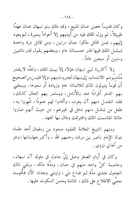 وكان في أيام الصغر وصل إلي جدول في ملوك آل نبهان، وعاصمة كل واحد منهم في عمان، ومدة ملكه، وبقي ذلك الجدول عندي مدة ثم ضاع مني، وليتني وجدته الآن فأُفيد محبي الأطلاع على ذلك، فائدة يحسن السكوت عليها.