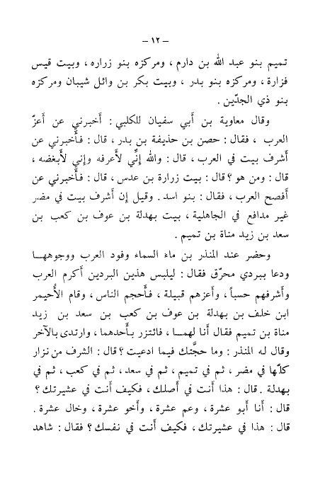 وقال معاوية بن أبي سفيان للكلبي: أخبرني عن أعز العرب، فقال: حصن بن حذيفة بن بدر، قال: فأخبرني عن أترف بيت في العرب، قال: والله أني لأعرفه وأني لأبغضه، قال ومن هو؟ قال: بيت زرارة بن عدس، قال: فأخبرني عن افصح العرب، فقال: بنو أسد. وقيل: إن أشرف بيت في مضر غير مدافع في الجاهلية، بيت بهدلة بن عوف بن كعب بن سعد بن زيد مناة بن تميم.