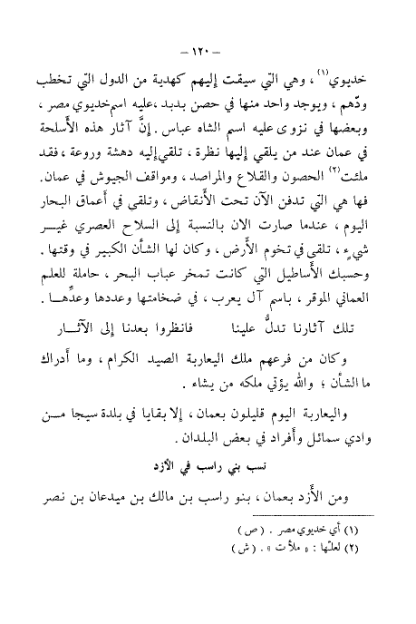 خديوي (¬١)، وهي التي سيقت إليهم كهدية من الدول التي تخطب ودهم، ويوجد واحد منها في حصن بدبد، عليه اسم خديوي مصر، وبعضها في نزوى عليه اسم الشاه عباس. لأن آثار هذه الأسلحة في عمان عند من يلقي إليها نظرة، تلقي إليه دهشة وروعة، فقد ملئت (¬٢) الحصون والقلاع والمراصد، ومواقف الجيوش بعمان. فها هي التي تدفن الآن تحت الأنقاض، وتلقى في أعماق البحار اليوم، عندما صارت الآن بالنسبة إلى السلاح العصري غير شيء، تلقى في تخوم الأرض، وكان لها الشأن الكبير في وقتها. وحسبك الأساطيل التي كانت تمخر عباب البحر، حاملة للعلم العماني الموقر، باسم آل يعرب، في ضخامتها وعدتها وعدها.