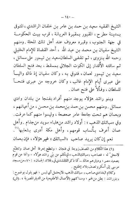 (¬١) هذا الكلام من المصنف زوبعة في فنجان، وتنطح بمعرفة أهل عمان، وتنطع لا محل له، فصاحب (سبائك الذهب) لم يتكلم عن بني راشد هؤلاء، وإنما عن قوم بصعيد مصر، وديارهم هناك -كما ذكر القلقشندي في (قلائد الجمان): ٧٠ - من مسجد موسى إلى أسكر ونصف بلاد أطفيح.