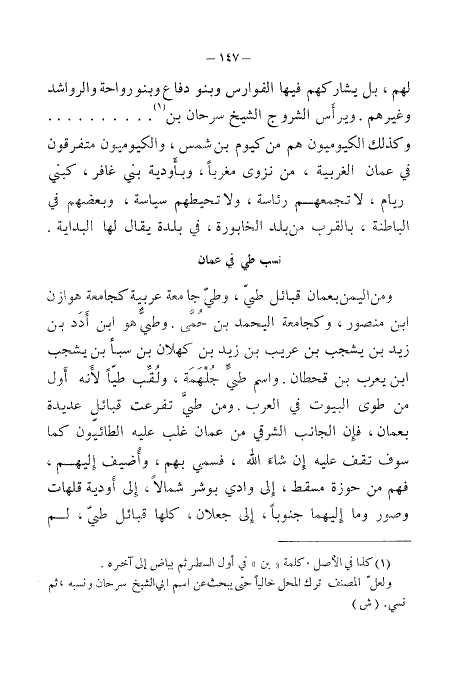 ومن اليمن بعمان قبائل طي، وطي جامعة عربية كجامعة هوازن بن منصور، وكجامعة اليحمد بن حمى. وطي هو ابن أدد بن بن زيد بن يشجب بن عريب بن زيد بن كهلان بن سبأ بن يشجب بن يعرب بن قحطان. واسم طي جلهمة، ولقب طيًا لأنه أول من طوى البيوت في العرب. ومن طي تفرعت قبائل عديدة بعمان، فإن الجانب الشرقي من عمان غلب عليه الطائيون كما سوف تقف عليه إن شاء الله، فسمي بهم، وأضيف إليهم، فهم من حوزة مسقط، إلى وادي بوشر شمالًا، إلى أودية قلهات وصور وما إليها جنوبًا، إلى جعلان، كلها قبائل طي، لم
