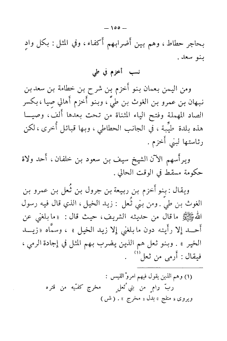 ومن اليمن بعمان بنو أخزم بن شرح بن خطامة بن سعد بن نبهان بن عمرو بن الغوث بن طي، وبنو أخزم أهالي صيا، بكسر الصاد المهملة وفتح الياء المثناة من تحت بعدها ألف، وصيا هذه بلدة طيبة، في الجانب الحطاطي، وبها قبائل أخرى، لكن رئاستها لبني أخزم.