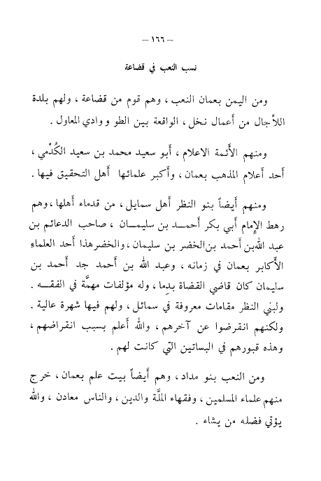 ومن اليمن بعمان النعب، وهم قوم من قضاعة، ولهم بلدة اللأجال من أعمال نخل، الواقعة بين الطو ووادي المعاول.