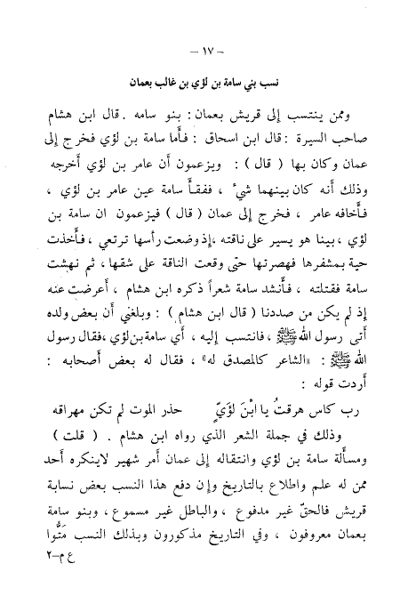 وذلك في جملة الشعر الذي رواه ابن هشام. (قلت:) ومسألة سامة بن لؤي وانتقاله إلى عمان أمر شهير لا ينكره أحد ممن له علم واطلاع بالتاريخ، وإن دفع هذا النسب بعض نسابة قريش فالحق غير مدفوع، والباطل غير مسموع، وبنو سامة بعمان معروفون، وفي التاريخ مذكورون، وبذلك النسب مَتُّوا
