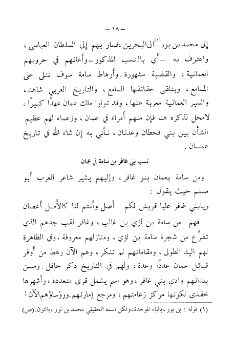 إلى محمد بن بور (¬١) إلى البحرين، فسار بهم إلى السلطان العباسي، وأعترف به أي بالنسب المذكور وأعانهم في حروبهم العمانية، والقضية مشهورة. وأرهاط سامة سوف تتلى على المسامع، ويتلقى حقائقها السامع، والتاريخ العربي شاهد، والسير العمانية معربة عنها، وقد تولوا ملك عمان عهدًا كبيرًا، لا محل لذكره هنا فان منهم أمراء في عمان، وزعماء لهم عظيم الشأن بين بني عدنان وقحطان، نأتي به إن شاء الله في تاريخ عمان.
