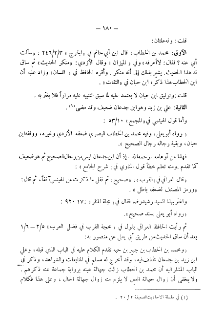 ابن زيد بن جدعان مختلف فيه، وقد أخرج له مسلم في المتابعات والشواهد)، وذكر في الباب المشار إليه أن محمد بن الخطاب زالت جهالة عينه برواية جماعة عنه ذكرهم. ولا يخفى أن زوال جهالة العين لا يلزم منه زوال جهالة الحال، وعلى هذا فكلام