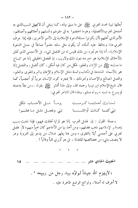 وجملة القول: إن فضل العرب إنما هو لمزايا تحققت فيهم فإذا ذهبت بسبب إهمالهم لإسلامهم ذهب فضلهم، ومن أخذ بها من الأعاجم كان خيرا منهم، (لا فضل لعربي على أعجمي إلا بالتقوى) "، ومن هنا يظهر ضلال من يدعو إلى العروبة وهو لا يتصف بشيء من خصائصها المفضلة، بل هو أوربي قلبا وقالبًا!
