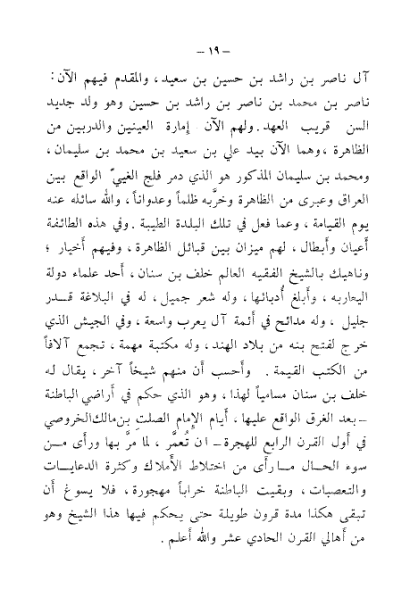 آل ناصر بن راشد بن حسين بن سعيد، والمقدم فيهم الآن: ناصر بن محمد بن ناصر بن راشد بن حسين وهو ولد جديد السن قريب العهد. ولهم الآن أمارة العينين والدربين من الظاهرة، وهما الآن بيد علي بن سعيد بن محمد بن سليمان، ومحمد بن سليمان المذكور هو الذي دمر فلج الغيي الواقع بين العراق وعبرى من الظاهرة وخربه ظلمًا وعدوانًا، والله سائله عنه يوم القيامه، وعما فعل في تلك البلدة الطيبة. وفي هذه الطائفة أعيان وأبطال، لهم ميزان بين قبائل الظاهرة، وفيهم أخيار؛ وناهيك بالشيخ الفقيه العالم خلف بن سنان، أحد علماء دولة اليعاربة، وأبلغ أدبائها، وله شعر جميل، له في البلاغة قدر جليل، وله مدائح في أئمة آل يعرب واسعة، وفي الجيش الذي خرج لفتح بنه من بلاد الهند، وله مكتبة مهمة، تجمع آلافًا من الكتب القيمة. وأحسب أن منهم شيخًا آخر، يقال له خلف بن سنان مساميًا لهذا، وهو الذي يحكم في أراضي الباطنة بعد الغرق الواقع عليها، أيام الإمام الصلت بن مالك الخروضي في أول القرن الرابع للهجرة أن تعمر، لما مر بها ورأى من سوء الحال ما رأى من أختلاط الأملاك وكثرة الدعايات والتعصبات، وبقيت الباطنة خرابًا مهجورة، فلا يسوغ أن تبقى هكذا مدة قرون طويلة حتى يحكم فيها هذا الشيخ وهو من أهالي القرن الحادي عشر والله أعلم.