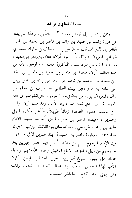 وممن ينتسب إلى قريش بعمان آل العطابي، وهذا اسم يقع على ذرية راشد بن حميد بن راشد بن ناصر بن محمد بن ناصر الغافري، الذي أفترقت عمان على يده، وخلف بن مبارك العنبوري الهنائي المعروف " بالقصير " جد أولاد هلال بن زاهر بن سعيد، وسوف نقف على سرد نسب المذكور في محله، والموجود الآن من هذه العائلة أولاد محمد بن ناصر بن حميد بن ناصر بن راشد ابن حميد بن محمد بن ناصر بن عامر بن رمثة بن حميس من بني سامة بن لؤي، ومن بيت العطابي هذا سيف بن مسلم بن سالم، المعروف بولد ابن رمثة في حوزة سرور، حتى انقرضوا في هذاالعهد القريب الذي نحن قيه، ولله الأمر، وقد ملك أولاد راشد ابن حميد حصون الظاهرة زمانًا طويلأ، وآخر ملكهم لبهلى وجبرين، وفيهما ناصر بن حميد الذي أخرجه منهما الإمام سالم بن راشد الخروصي رحمه الله تعالى يوم الثالث من شهر شعبان سنة ١٣٣٤، وذرية ناصر بن حميد في بلد جبرين لا في حصنها، فأن الإمام المرحوم سالم بن راشد، أباح لهم حصن جبرين بعد خروجهم من بهلى، فنزعه الإمام الخليلي رحمه الله منهم بواسطة عامله على بهلى الشيخ أبي زيد، حين اختلفوا فيمن يكون الأمير لهذا الحصن، والآن بيد عمال السلطان تحت رئاسة والي بهلى بعد الفتح السلطاني لعمان.