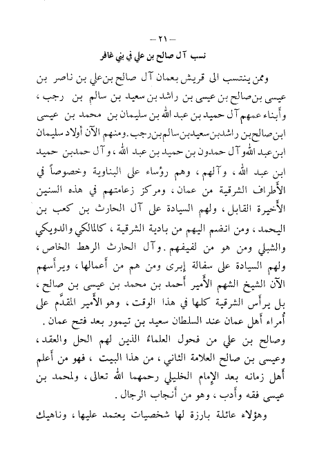وممن ينتسب إلى قريش بعمان آل صالح بن علي بن ناصر بن عيسى بن صالح بن عيسى بن راشد بن سعيد بن سالم بن رجب، وأبناء عمهم آل حميد بن عبد الله بن سليمان بن محمد بن عيسى ابن صالح بن راشد بن سعيد بن سالم بن رجب. ومنهم الآن أولاد سليمان ابن عبد الله وآل حمدون بن حميد بن عبد الله، وآل حمد بن حميد ابن عبد الله، وآلهم، وهم رؤساء على البناوية وخصوصًا في الأطراف الشرقية من عمان، ومركز زعامتهم في هذه السنين الأخيرة القابل، ولهم السيادة على آل الحارث بن كعب بن اليحمد، ومن انضم إليهم من بادية الشرقية، كالمالكي والدويكي والشبلي ومن هو من لفيفهم. وآل الحارث الرهط الخاص، ولهم السيادة على سفالة أبرى ومن هم من أعمالها، ويرأسهم الآن الشيخ الشهم الأمير أحمد بن محمد بن عيسى بن صالح، بل يرأس الشرقية كلها في هذا الوقت، وهو الأمير المقدم على أمراء أهل عمان عند السلطان سعيد بن تيمور بعد فتح عمان. وصالح بن علي من فحول العلماء الذين لهم الحل والعقد، وعيسى بن صالح العلامة الثاني، من هذا البيت، فهو من أعلم أهل زمانه بعد الإمام الخليلي رحمهما الله تعالى، ولمحمد بن عيسى فقه وأدب، وهو من أنجاب الرجال.