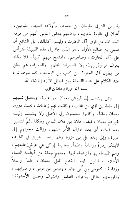 بفارس الشرق سليمان بن حميد، وأولاده النجب الميامين، أعيان في طليعة شعبهم، ويظنهم بعض الناس أنهم من فرقة السمرات من فرق آل الحارث، وليسوا كذلك بل الشائع أن عيسى بن صالح الأول، هو الذي جاء إلى هذه القبيلة فنرأس على آل الحارث، وصاهرهم، وأندمج فيهم كليًا، فلا يكاد يعرف هو وذراريه إلا بالسمرات فافهم. والسمرات هم بطن من بطون آل الحارث بن كعب بن اليحمد، كما سوف تراه عند الكلام على هذه القبيلة بين قبائل الأزد إن شاء الله.