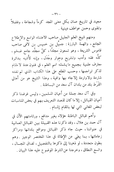 ومنهم شيخ العلم الجليل صاحب الاعتناء الواسع والاطلاع الجامع، والهمة البارزة: جميل بن خميس بن لافي صاحب قاموس الشريعة، وهو تسعون مجلدًا، كل مجلد جامع ضخم، كله فقه وأدب وتشريع وحوار وجدل، وأنه لأشبه بدائرة معارف علمية بجميع ما يشمله اسم العلم، في فنون عدة لامقام لذكر نراجمهان وحسب المطلع على هذا الكتاب الذي لم تفته شاردة ولا واردة إلا جاء بها وافية، وهذا الشيخ هو من أهالي القرط بلد من بلدان آل سعد بن البطانة.