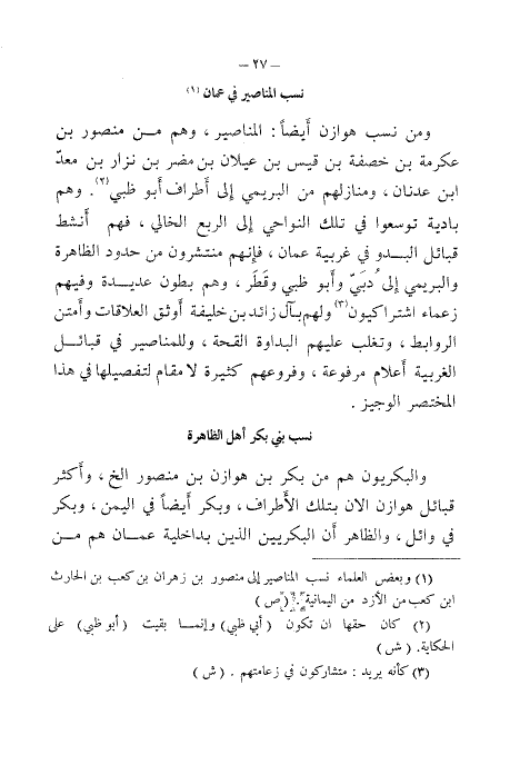 ومن نسب هوازن أيضا: المناصير، وهم من منصور عكرمة بن خصفة بن قيس بن عيلان بن مضر بن نزار ابن عدنان، ومنازلهم من البريمي إلى أطراف أبو ظبي (¬٢). بادية نوسعوا في نلك النواحي إلى الربع الخالي، فهم قبائل البدو في غربية عمان، فأنهم منتشرون من حدود البريمي إلى دبي وأبو ظبي وقطر، وهم بطون عديدة وزعماء اشتراكيون (¬٣) ولهم بآل زائدبن خليفة أوثق العلاقات والروابط، وتغلب عليهم البداوة القحة، وللمناصير في قبائل الغربية أعلام مرفوعة، وفروعهم كثيرة لا مقام لتفصيلها في المختصر الوجيز.
