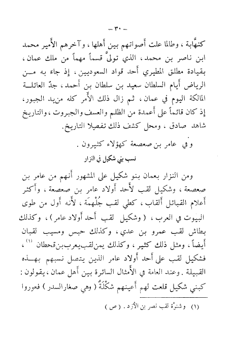 ومن النزار بعمان بنو شكيل على المشهور أنهم من عامر بن صعصة، وشكيل لقب لأحد أولاد عامر بن صعصة، وأكثر أعلام القبائل ألقاب، كطي لقب جُلْهمَة، لأنه أول من طوى البيوت في العرب، " وشكيل لقب أحد أولاد عامر "، وكذلك بطاش لقب عمرو بن عدي، وكذلك حبس ومسيب لقبان أيضًا، ومثل ذلك كثير، وكذلك يمن لقب يعرب بن قحطان (¬١)، فشكيل لقب على أحد أولاد عامر الذين يتصل نسبهم بعذه القبيلة. وعند العامة في الأمثال السائرة بين أهل عمان، يقولون: كبني شكيل قلعت لهم أعينهم شكْلَةٌ " (وهي صغار السدر) فعوروا
