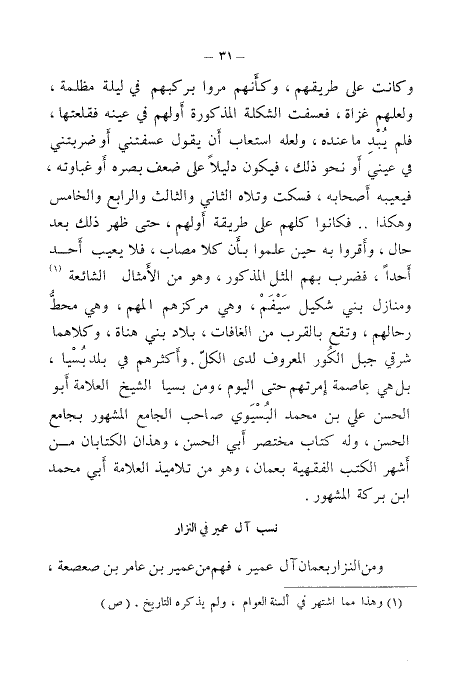 وكانت على طريقهم، وكأنهم مروا بركبهم في ليلة مظلمة، ولعلهم غزاة، فعسفت الشكلة المذكورة أولهم في عينه فقلعتها، فلم يبدو ما عنده، ولعله أستعاب أن يقول عسفتني أو ضربتني في عيني أو نحو ذلك، فيكون دليلًا على ضعف بصره أو غباوته، فيعيبه أصحابه، فسكت وتلاها الثاني والثالث والرابع والخامس وهكذا .. فكانوا كلهم على طريقة أولهم، حتى ظهر ذلك بعد حال، وأقروا به حين علموا بأن كلا مصاب، فلا يعيب أحد أحدًا، فضرب بهم المثل المذكور، وهو من الأمثال الشائعة (¬١) ومنازلهم بني شكيل سيفهم، وهي مركزهم المهم، وهي محط رحالهم، وتقع بالقرب من الغافات، بلاد بني هناة، وكلاهما شرقي جبل الكور المعروف لدى الكل. وأكثرهم في بلد بسيا، بل هي عاصمة أمرتهم حتى اليوم، ومن بسيا الشيخ العلامة أبو الحسن علي بن محمد البسيوي صاحب الجامع المشهور بجامع الحسن، وله كتاب مختصر أبي الحسن، وهذان الكتابان من أشهر الكتب الفقهية بعمان، وهو من تلاميذ العلامة أبي محمد ابن بركة المشهورة.