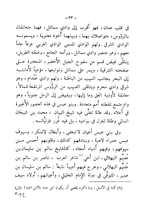 في قلب عمان، قهو أقرب إلى وادي سمائل، فهما متعانقان بالرؤوس، متواصلان بهما، وبينهما أخوة معنوية، ويسمونه الوادي الشرقي. ولهم الوادي المسمى الوادي الغربي عرفًا عامًا معهم، وهو عنصر وادي سمائل، ورأسه الجامع، وعنقه الطويل، يتلقى فيض قسم من سفوح الجبل الأخضر، المنحدرة على صفحته الشرقية، ويمر من سمائل وتوابعها، ومؤديًا لأمانته إلى البحر بجانب السيب من البطانة، ولهم وادي عندام، وهو شرقي وادي محرم ويتلقى الصيب من الرؤوس المرتفعة شمالًا، معانقة لأودية العق وما إليها، ويفيض إلى الرمل جنوبًا، وهو واد متسع تقطنه أمم متعددة. وبنو عبس في هذه العصور الأخيرة في أعلاه. وقد طالما تغنَّى فيه شيخ البيان، محمد بن شيخان السالمي وطالما تغزل في بواديه، بل قيه غرز غزلياته.