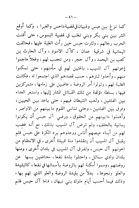 كما نزغ بين عبس وذبيان في قضية داحس والغبرا، كما أوقع الشر بين بني بكر وبني تغلب في قضية البسوس، حتى أفنت الحرب رجالهم، وثارت حبس حين رأت الغلبة عليها، فحالفت اليمانية في شرقية عمان، كآل الأسود، وآل الحارث بن كعب بن اليحمد، وآل حجر، ومن تصعب لهم، وفعلًا هاجموا أخوتهم آل المسيب، باغتين لهم في مأمنهم، حتى تمكنوا منهم، وأخذوا ثارهم، حسب قصدهم الذي اجتمعوا له، فكانت الغلبة لهم، وتولوا أمر الروضة، عاضين على زمامها، متمركزين فيها، بسلطة مؤلفة من تلك القبائل المشار إليها، واستعر العداء بين الفئتين، ولعب الشيطان فيهم، حتى باعد بين الحيين، وفرق بين الفئتين، وحتى تناسى القوم ما بينهم من الأواصر، وأهملوا ما بينهم من الحقوق، ورضي آل حبس أن يكونوا يمانية بالحلف، ولم ترض آل المسيب بذلك، مع أنه غضب لهم من أبناء عيصهم أناس ووعدوهم برد الكرة على حبس قلم يقبل آل المسيب أن يتقلدوا منة قبيلة اخرى، في الانتقام من آل حبس، وتفرق آل المسيب في بلدان اخرى، ومنها بلدان وادي سمائل، واحتلوا بلدة نفع، متعاضين بها عن روضتهم، وسموا أمكنة لهم بالروضة بأسمائها في نفعا، كالبليدة، والعاو ونحوها، بدلًامن بليدة الروضة والعلو الذي لهم بها، وذلك فيما أحسب أيام ملوك بني نبهان، فأما آل حبس فلم